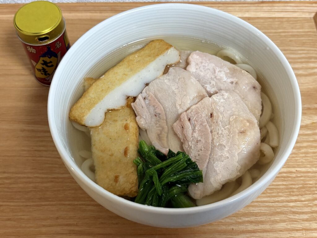 11時に朝昼兼用(ブランチ)で肉うどんを食べます。冷凍うどんは便利です😃。