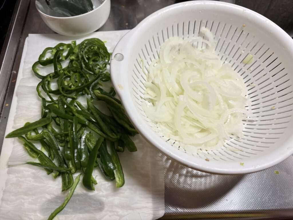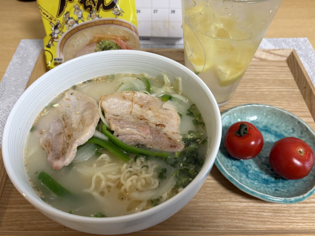 夕方早めに晩ごはんを食べます。ピーマン、タマネギをたっぷり入れたインスタントラーメンです。野菜の旨味が出て美味しかったです。食後に残った野菜をカットして冷凍保存しました。