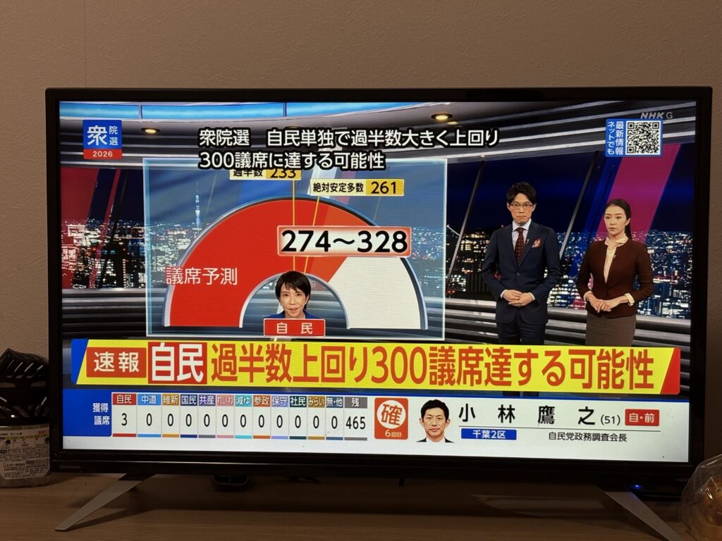 今日2度目のテレビです。20時に各テレビ局が衆院選の開票速報を開始。前日まで報道されていた予想議席数ですが、ホントかな?と思っていたらその通りになりました。西銘さんが“島々の物価高は問題だと考えている”と発言されていましたので、期待しています🤗。