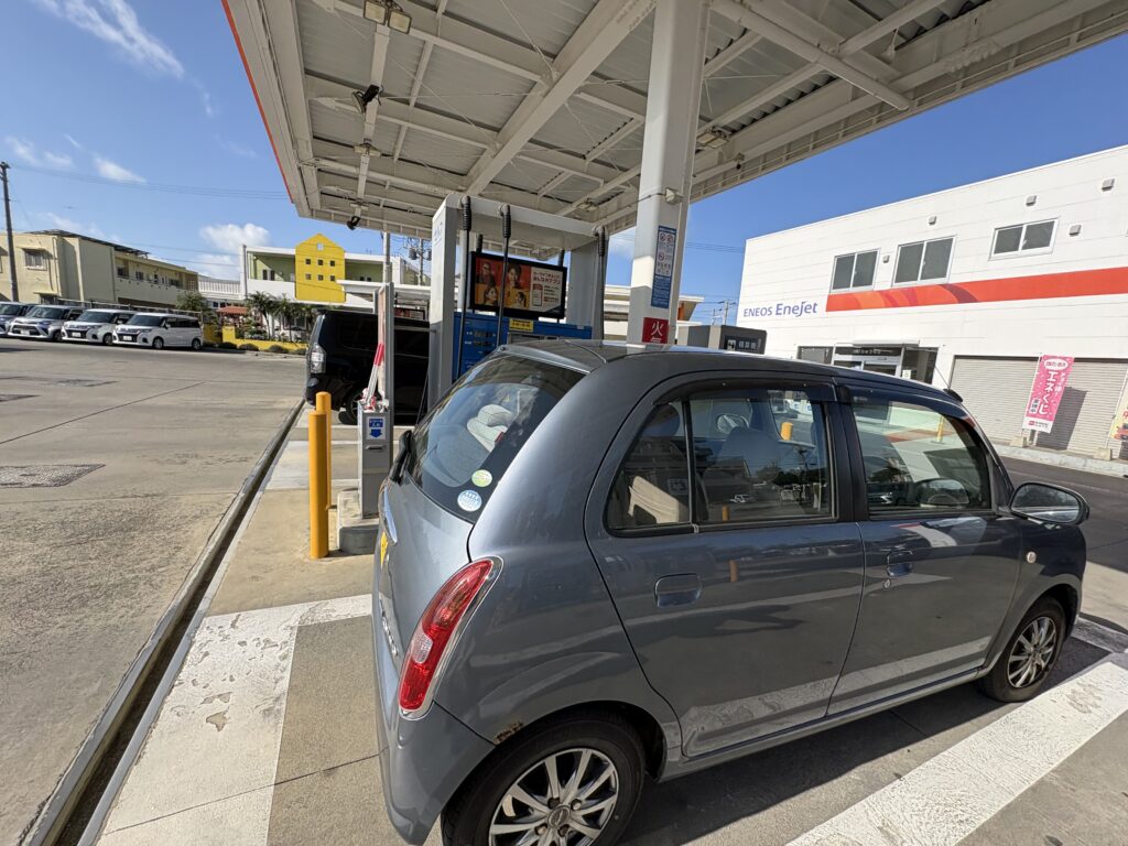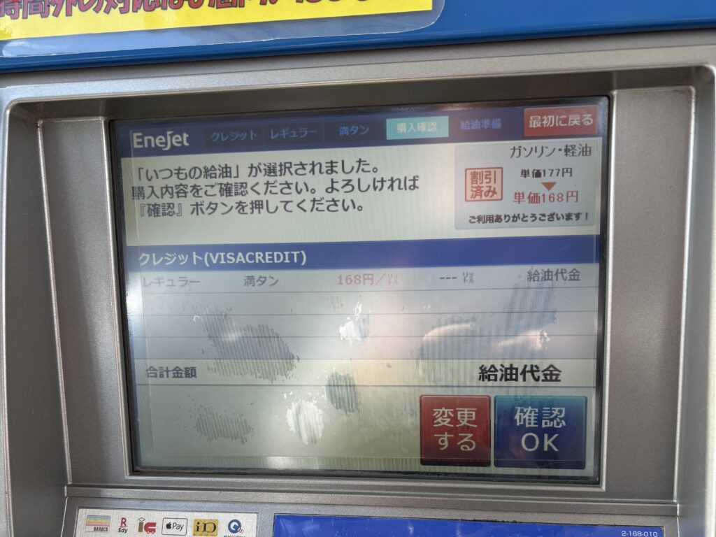 ガソリンスタンドで給油をします。スマホアプリで9円引きになり、168円でした。先月より1円上がっています。