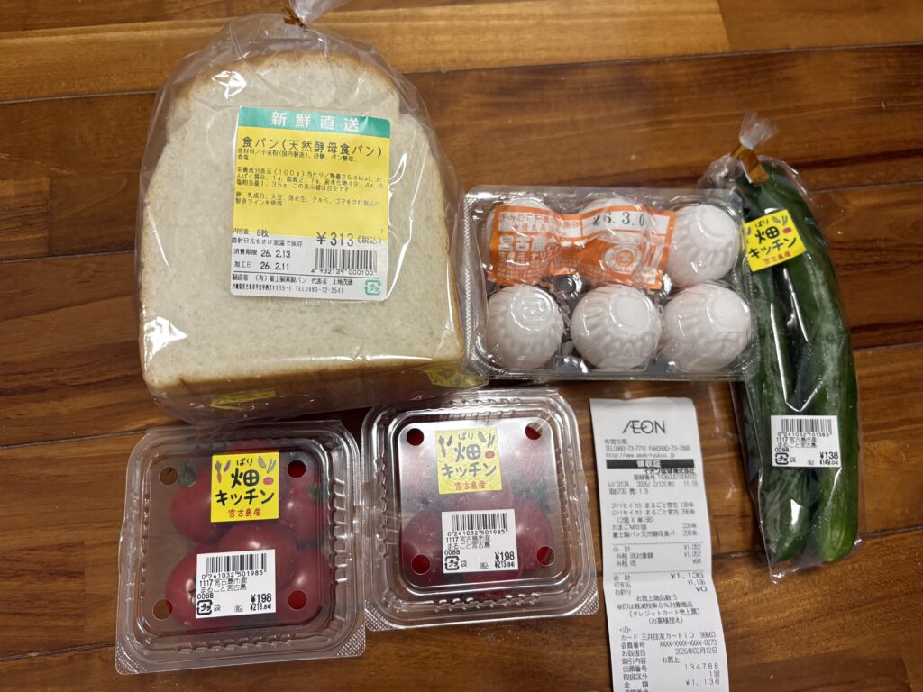 パンを買いにマックスバリュへ。まず【まるごと宮古島】のほれまる(ミニトマト)を購入。パンコーナーへ行くと富士パンの食パン(天然酵母)があったので買って帰りました。帰宅後、洗濯物を取り込み、雑用をして再び外出します。