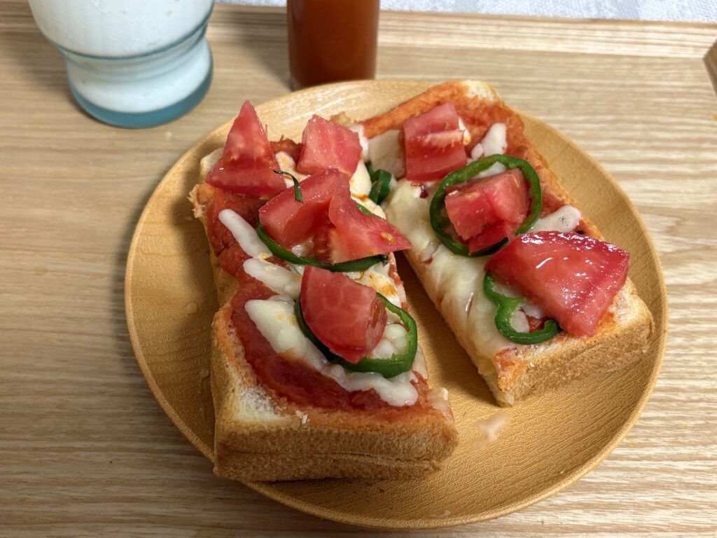 6時起床、疲れが残っています。7時過ぎにピザトーストを作って食べます。【富士パン】のおはよー食パンと【まるごと宮古島】のトマトがダブル主役でした😃。