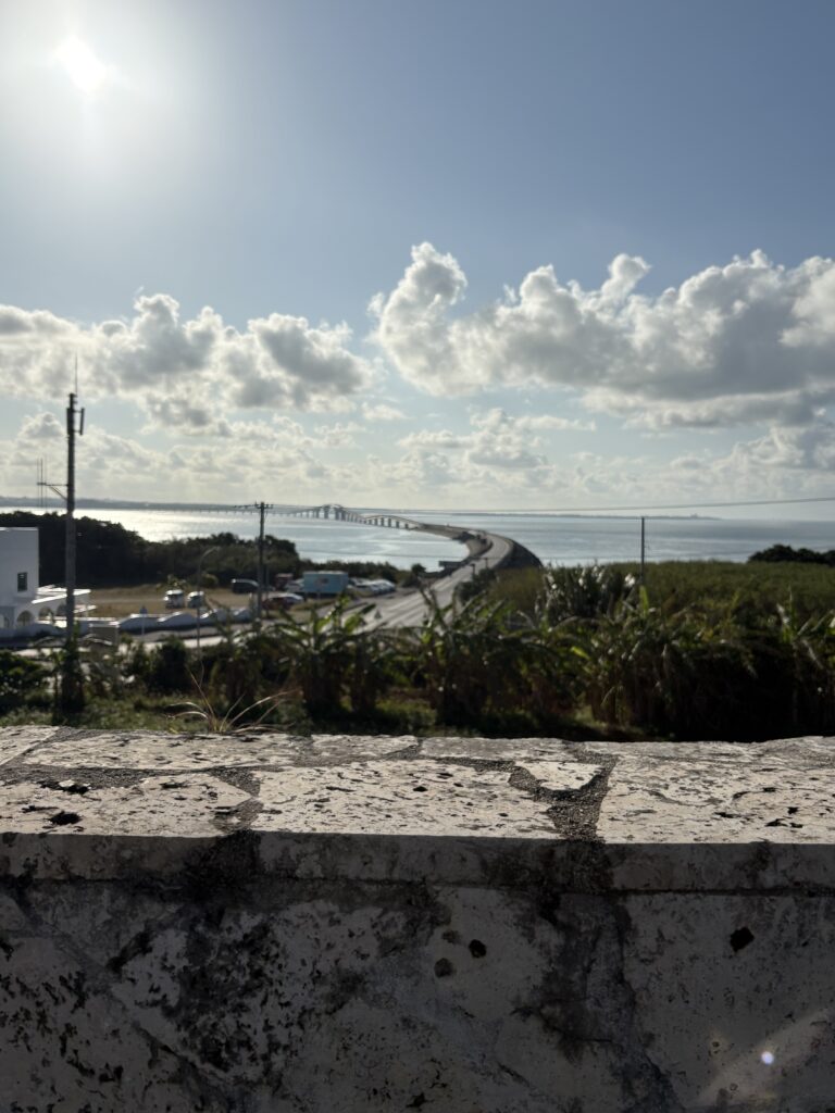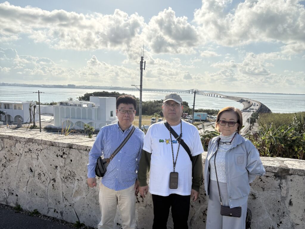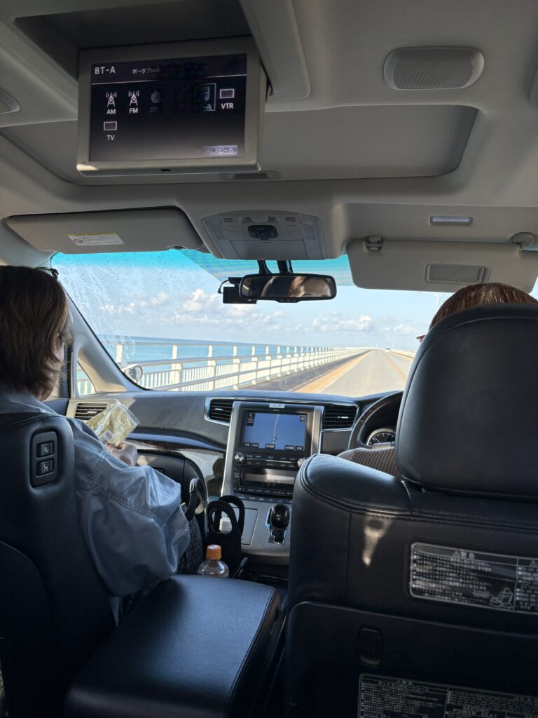 8時半に沖縄県中小企業家同友会のスタッフが車で迎えに来てくれます。今日1日私と一緒に講師の方をご案内する【リゾートライフ】の柿本さんが車に乗っています。講師の方をホテルへお迎えに上がり伊良部大橋を渡ります。まず橋が見渡せる展望スポットをご案内しました😃。