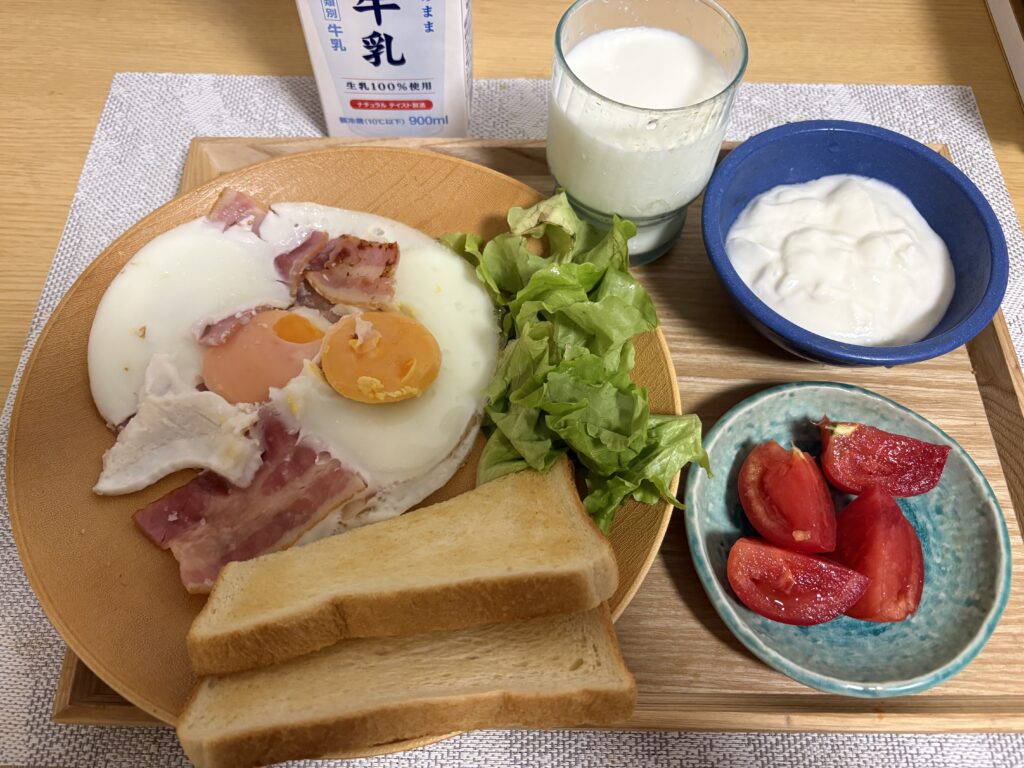 5時に目が覚めます。雨音がするので玄関を開けると月が輝いています。いつもより早く6時に朝ごはんを食べます。ベーコンエッグの卵の黄身が流れないように弱火で長目に焼くと、黄身がカチカチになりました。次回はいい具合に作りたいです😃。