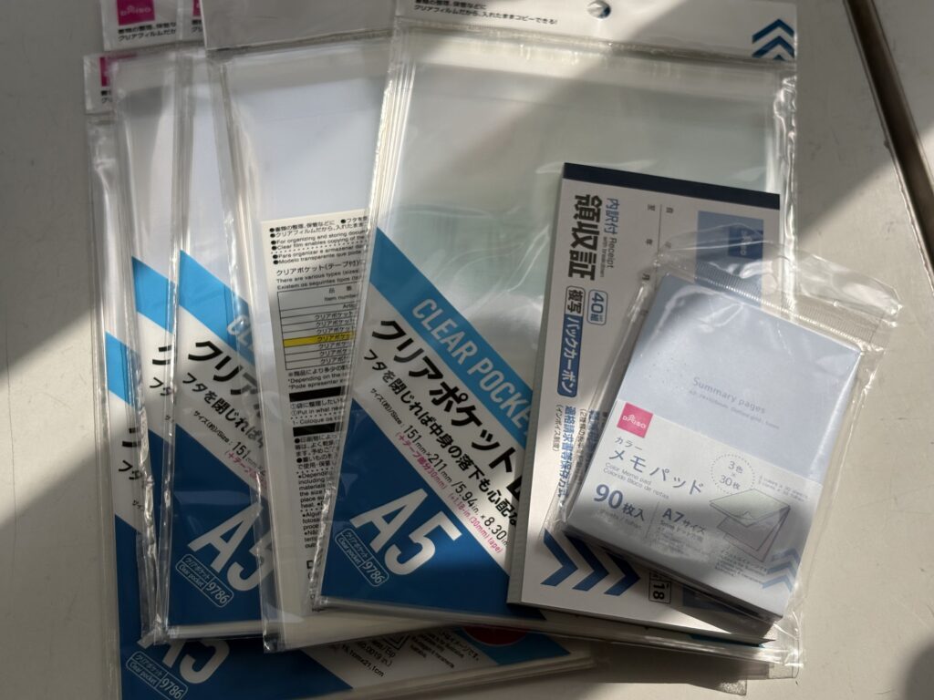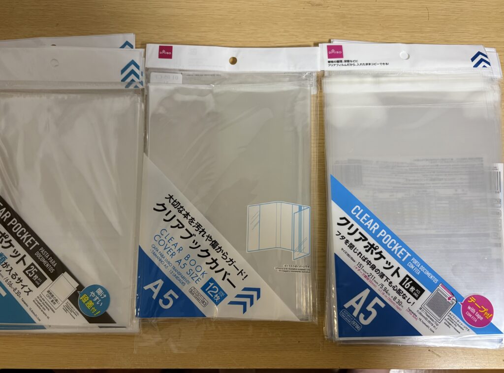 【ダイソー】にアナタビ宮古島キット用にA5サイズのクリアポケットを見に行きます。宮古島ではずっと品切れでが続いています。先月那覇で見つけて買ったのですが、1種類はシールがないただのポケット(下の画像の左側)もう1種類がクリアブックカバー(中央)でした💦。今日やっと欲しかったクリアポケットが購入できました(右側)。似てるでしょ😆。