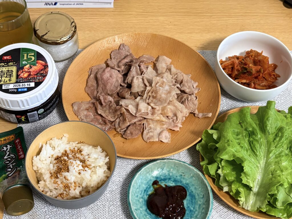 晩ごはんは韓国焼肉です。サンチュがなかったのであたらすで買ったリーフレタスで代用。県産の豚肉は肩ロースとバラの2種類。昼ごはんを抜いたので、たくさん食べました😃。
