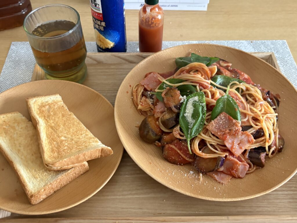 昼ごはんは再びベーコンとナスのスパゲティです。ニンニクをオリーブオイルで炒めてからトマトピューレ、そこにひろゆきのコーレーグースと多良間の塩爺の天日塩を入れて最高のソースが仕上がります🤗。お店で食べる味でした😋。