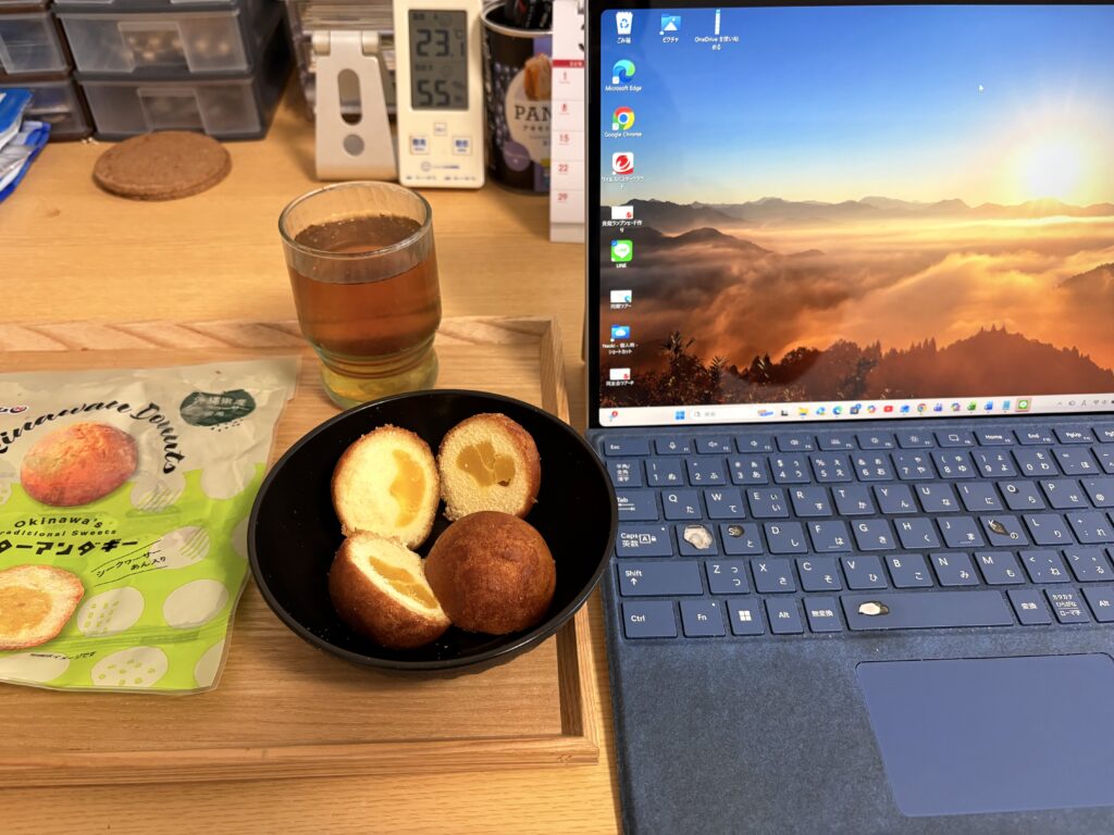 睡眠不足だったので1時間半も昼寝をしてしまいました💤。自宅で仕事を再開しますが、調子が上がりません。3時のおやつは先日サンエーで買ったオキハムの「シークヮーサー餡入りサーターアンダギー」です。オーブンで温めて食べたところ、そこそこ美味しかったです。洗濯物を取り込む時にゴミ置き場を見ると、朝に出したビンがなくなっていて安心しました☺️。