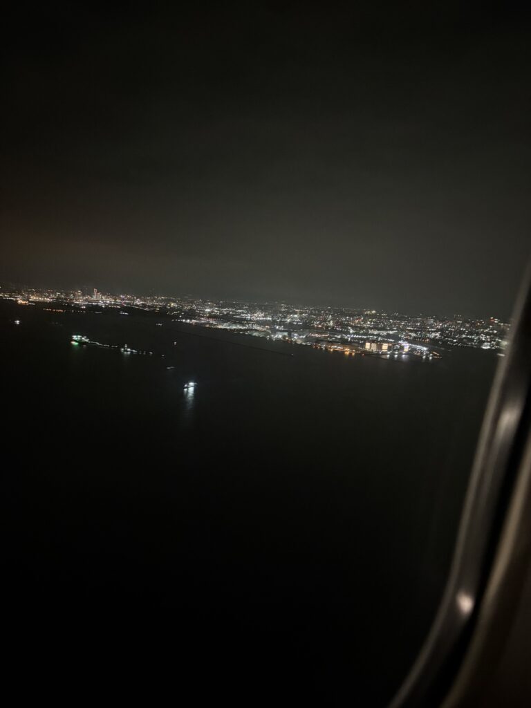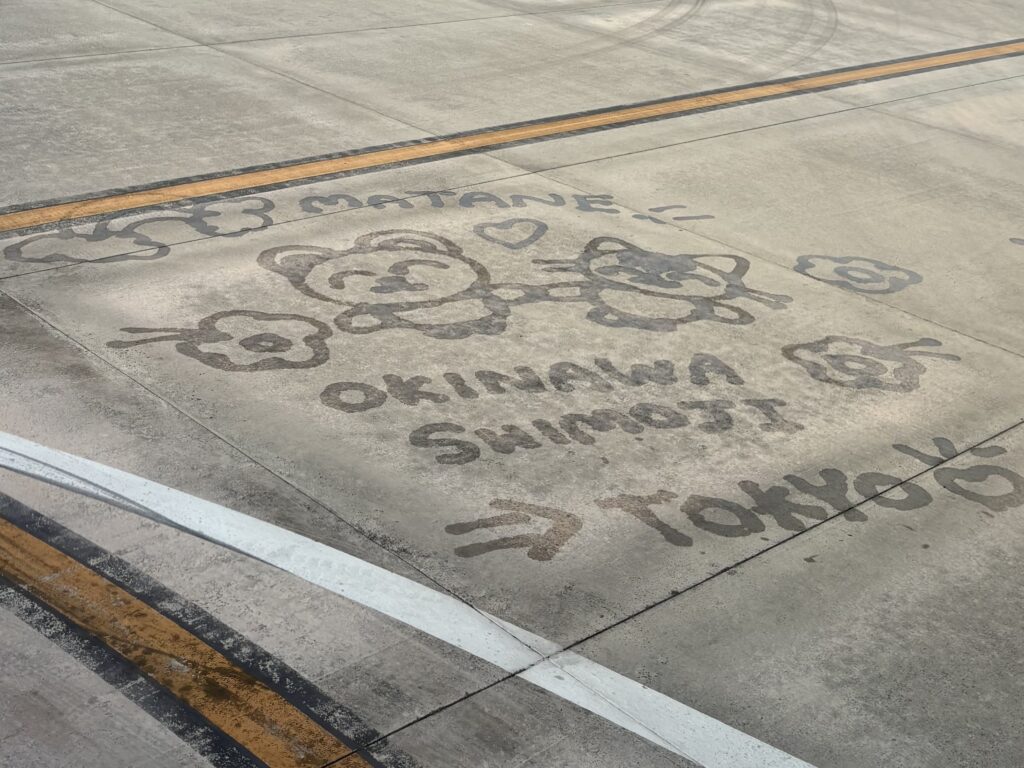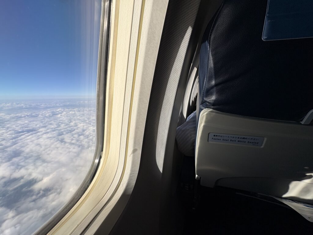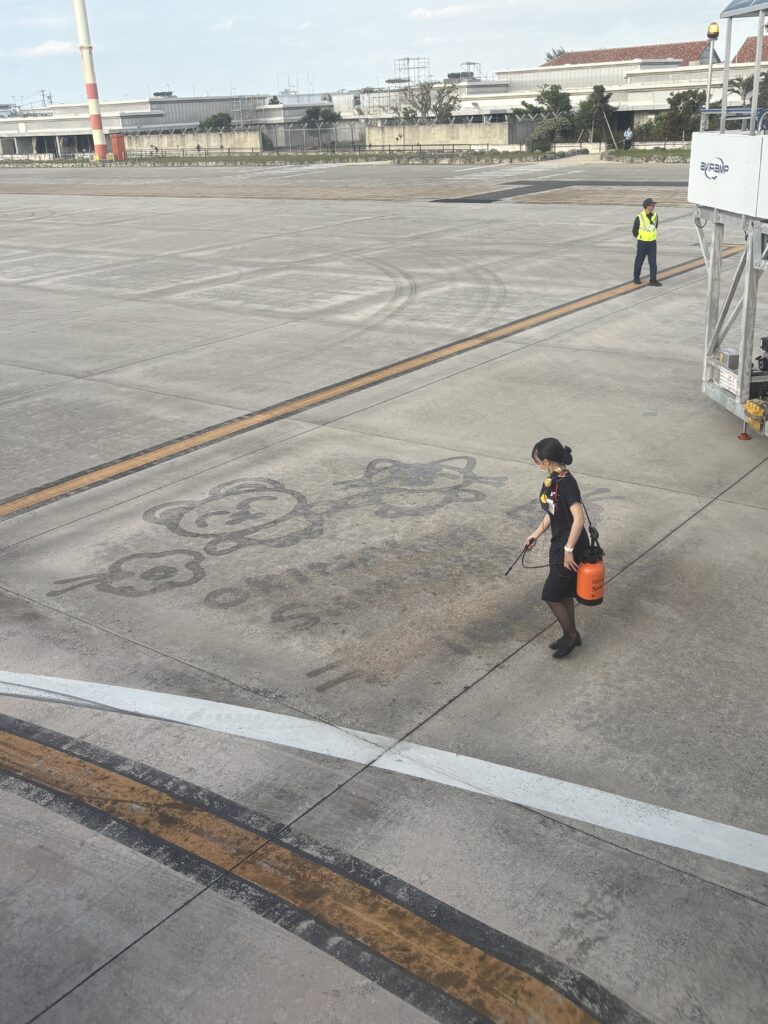 早めに搭乗し外の風景を楽しみます。CAが2度水アートを描いていましたが、どちらもすごく上手でした🤗。今日も10人のスタッフが大きく手を振って見送ってくれました😊。
