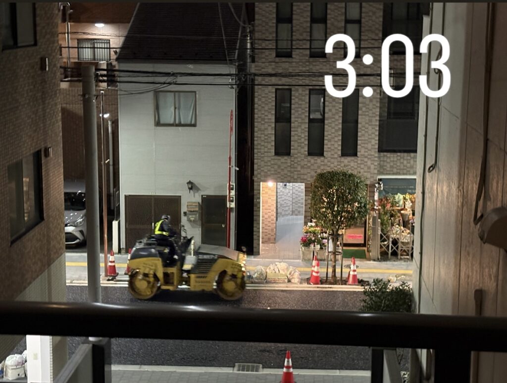 真夜中に騒音で目が覚めます。カーテンを開けてバルコニーに出ると道路舗装工事の真最中です😮。明け方まで眠れませんでした。朝ごはんを自宅で済ませて、洗濯、浴室、トイレ掃除をして外出しました。