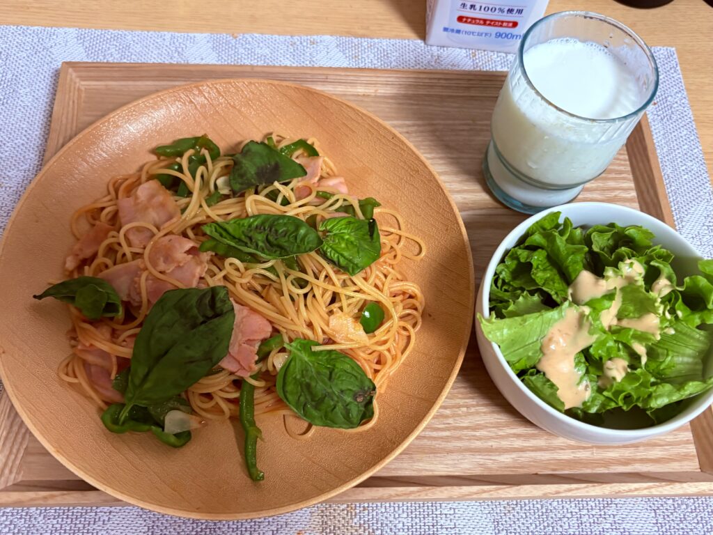 20時、晩ごはんを作って食べます。トマトピューレの買い置きがなかったのて、ケチャップでナポリタンを作りました。