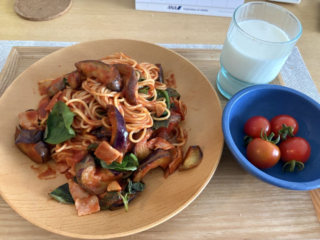昼ごはんはナスとベーコンのアラビアータスパゲティです。味付けは炒めたガーリックオイル、ひろゆきのコーレーグースと多良間の塩爺の天日塩のみ😃。シンプルで美味しいのですが酸味が強めです。何か酸味を抑えるモノを入れると美味しくなりそうです。砂糖?