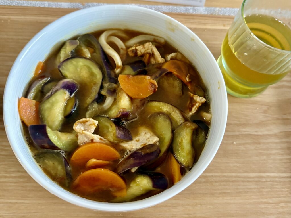晩ごはんは茄子カレーうどん。茄子は漢字かひらがなかカタカナかで迷います😆。茄子を使ったレパートリーを増やしたいです。