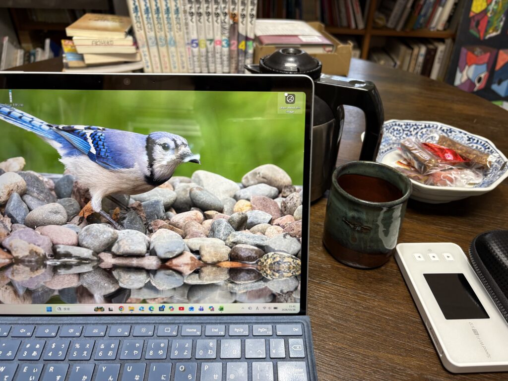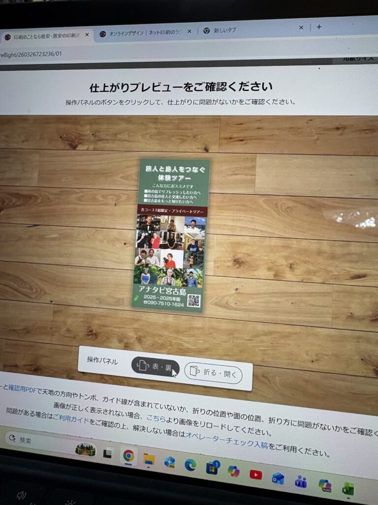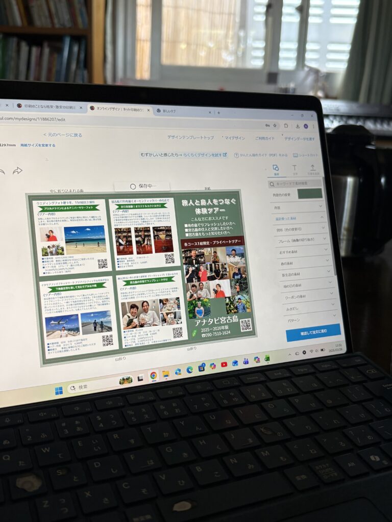 10時過ぎ冝保さん宅で仕事を開始します。今朝も冝保さんがアメリカンコーヒーを淹れてくれます😊。仕事は順調に進み、昼には持参したお弁当を食べます。お弁当を作ったのは宮古島に移住して初めてかもしれません。その後はアナタビ宮古島の新しいリーフレットをデザインし、印刷を発注しました🤗。今回は一部のツアーの金額を変更し、リーフレットの背景色を変えました。