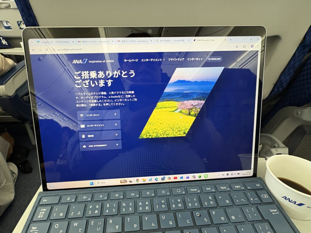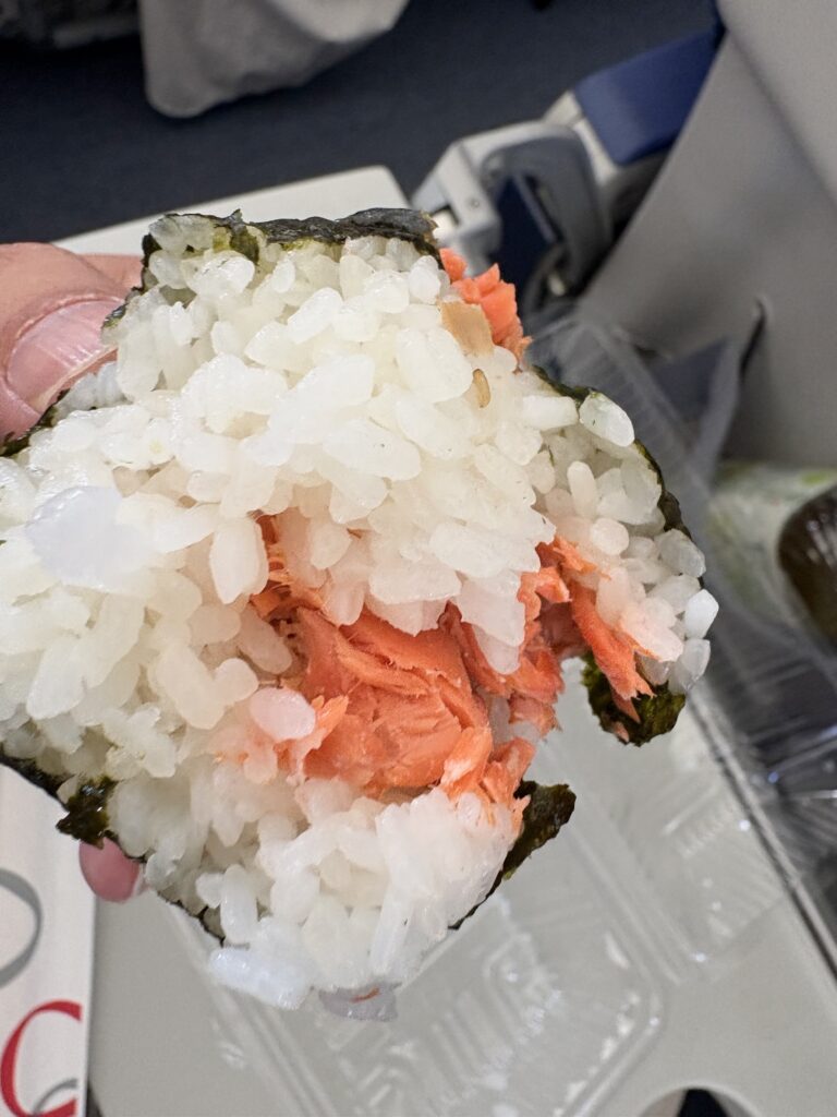 機内は満席近く、圧迫感があります。春休みなので家族連れが多いです。“満席に近い予約をいただいています。”とアナウンスがありましたが、隣りの席が空席でラッキーでした😃。昨日に続き昼ごはんは【権兵衛】の鮭と焼きたらこのおにぎり。しあわせな味です☺️。飛行中、揺れている時間が多くあまり仕事はできませんでした。