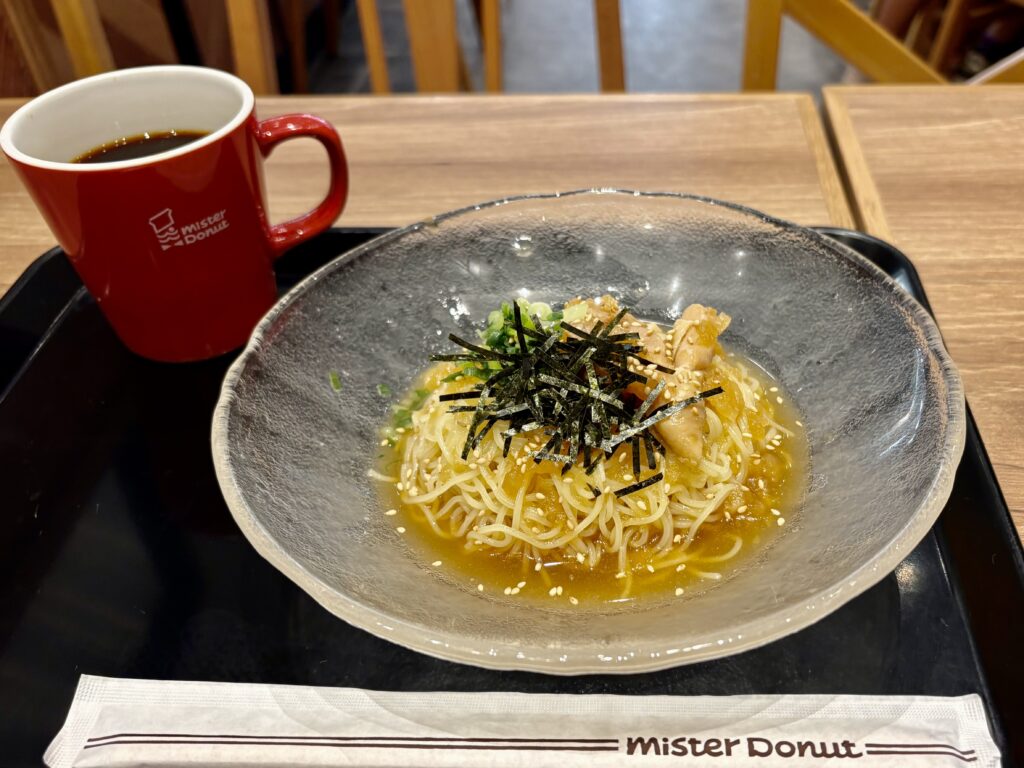 14時過ぎ宮古シティに到着。【和風亭】【大阪王将】の選択肢もあったのですが、15時半に【ミスタードーナツ】でガイドの平良さんと待ち合わせなので、ミスドで昼ごはんを食べることにします。新商品の麺類から和風の鶏みぞれ涼風麺を選びました😃。しばらく仕事をしてから、平良さんと1時間仕事の打ち合わせをしました。