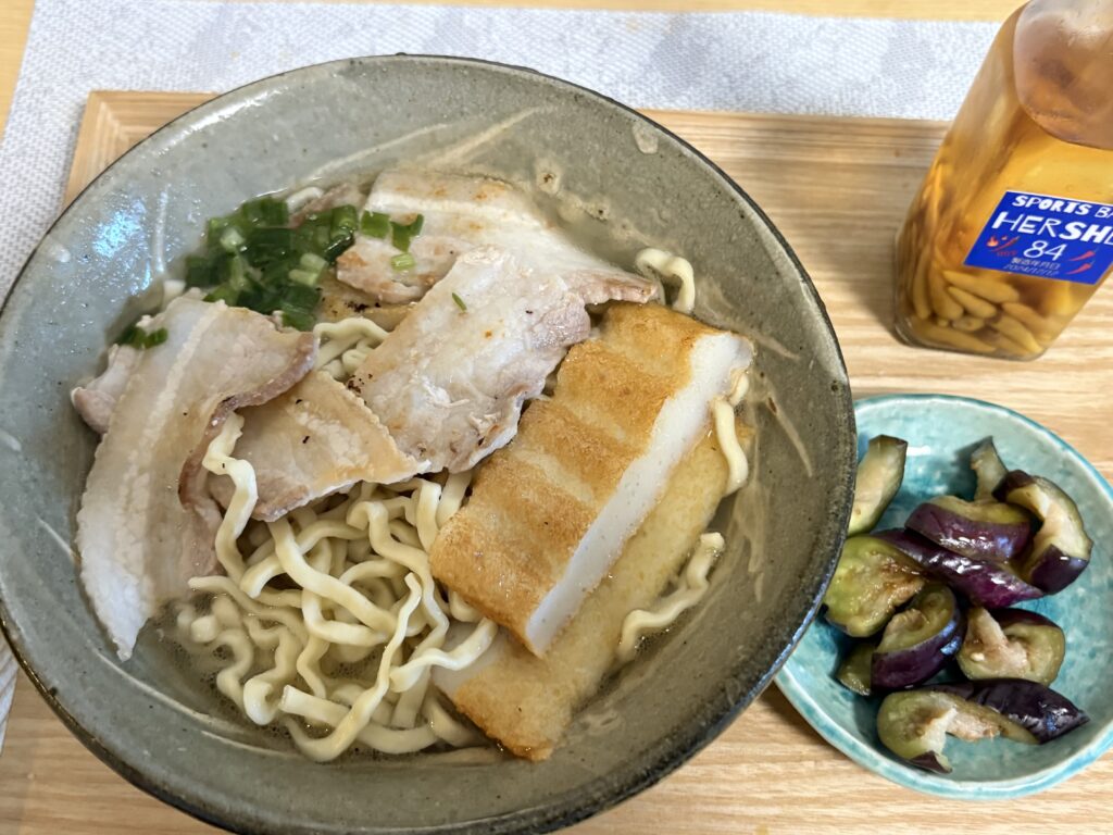 晩ごはんはローソンセレクトの沖縄そばです。県産豚バラと宮古島のかまぼこをトッピングしました。夜はYouTube鑑賞と読書でした。