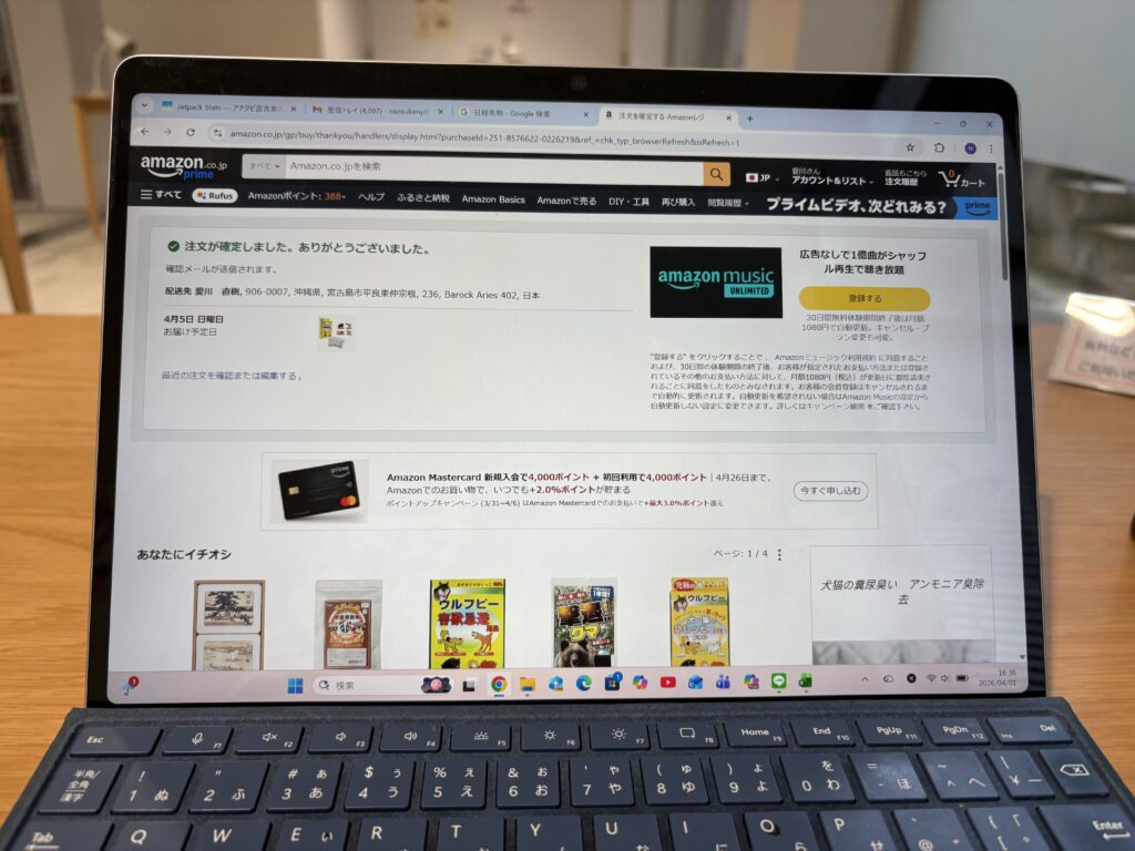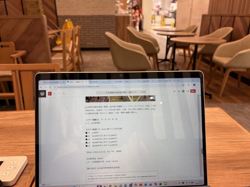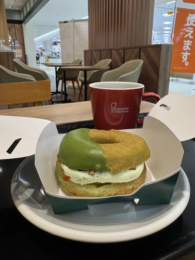 10時過ぎ【ミスタードーナツ】に入店。【祇園辻利】とのコラボ商品を買います。今日からアナタビ宮古島の体験ツアーの半分が値上げするので、ホームページの修正作業をします。しばらくイートインスペースは貸し切り状態ですが、家族連れが徐々に増えて賑やかになりました。春休みですからね。