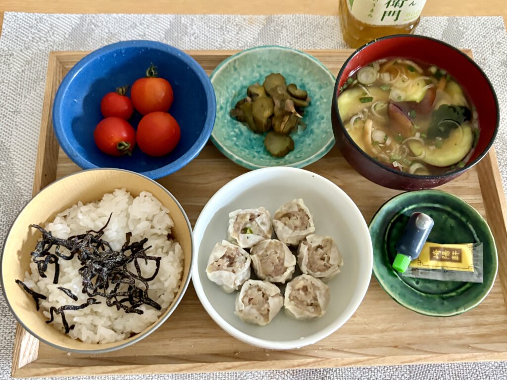 昼ごはんは昨夜のメニューとほぼ同じ。崎陽軒のシウマイがメインです。午前中【マックスバリュ南店】で買った宮古島産のナスで味噌汁を作りました😃。