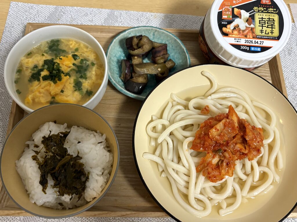晩ごはんはキムチうどんです。明日は少しでも体重が減っていることを願って寝ました。