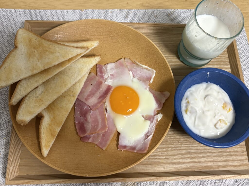 6時半起床。体重計に乗ると昨日と全く同じ体重です。朝ごはんはベーコンエッグです。目玉焼きは今までで1番うまくできました😃。