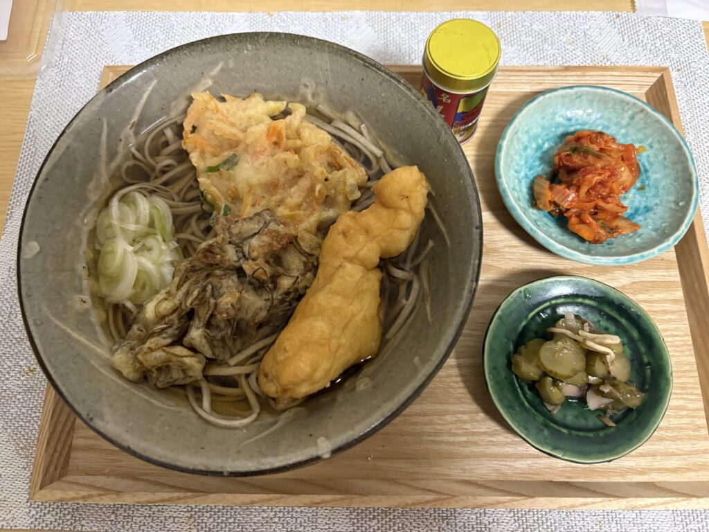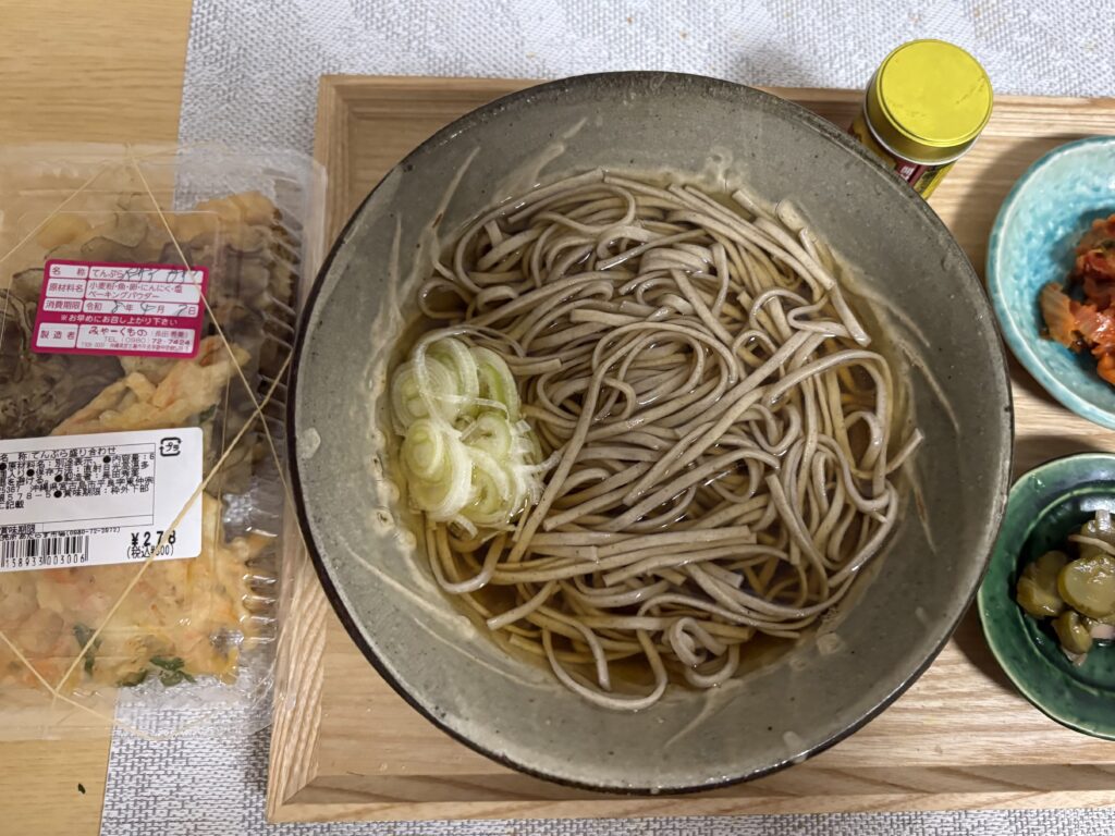 晩ごはんは天ぷらそばです。【あたらす市場】で買った天ぷらは6個入りで300円。2回に分けて盛り、全部食べました。