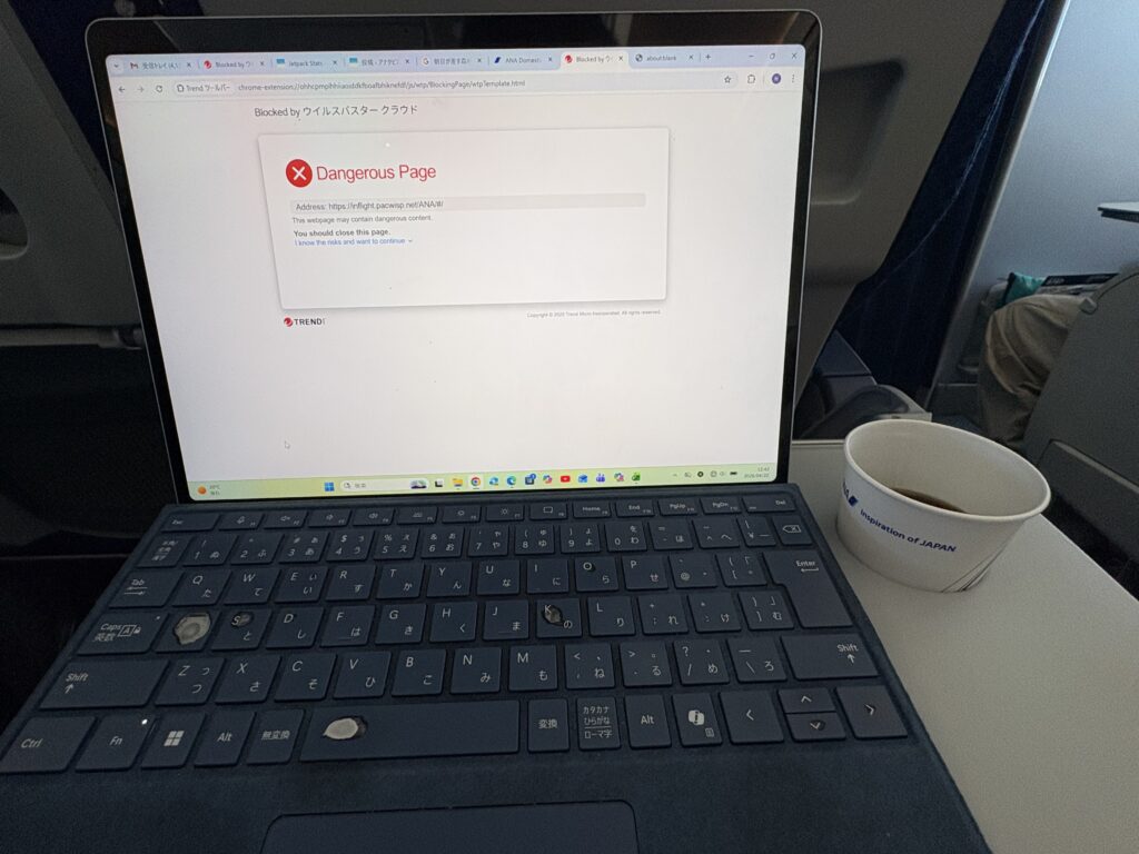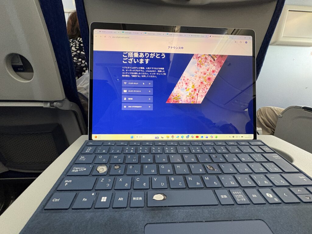 ANA羽田行きは15分遅れて出発。7〜8割ぐらいの搭乗率です。隣が空席だったので、横を気にせず仕事ができます。ANAのWifi にスマホは繋がるのですが、パソコンはウイルスバスターで安全ではないサイトと判断され繋がりませんでした。スマホが繋がるので仕事に影響はありませんでした😃。羽田空港には少し遅れて到着しました。