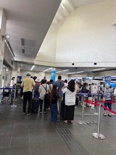 10:40 予約していた【まるちくタクシー】に乗り宮古空港へ向かいます。タクシー番号25番のおじさんと楽しく話をしました😊。空港はかなり混雑していて、半分以上がシニアのご夫婦やグループです。