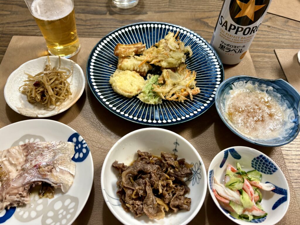 空港からは実家へ直行します。17時に晩ごはんを食べます。おかんメシは鯛の塩焼き、牛肉のしぐれ煮、天ぷらなどです。〆はビーフカレーでした🤗。