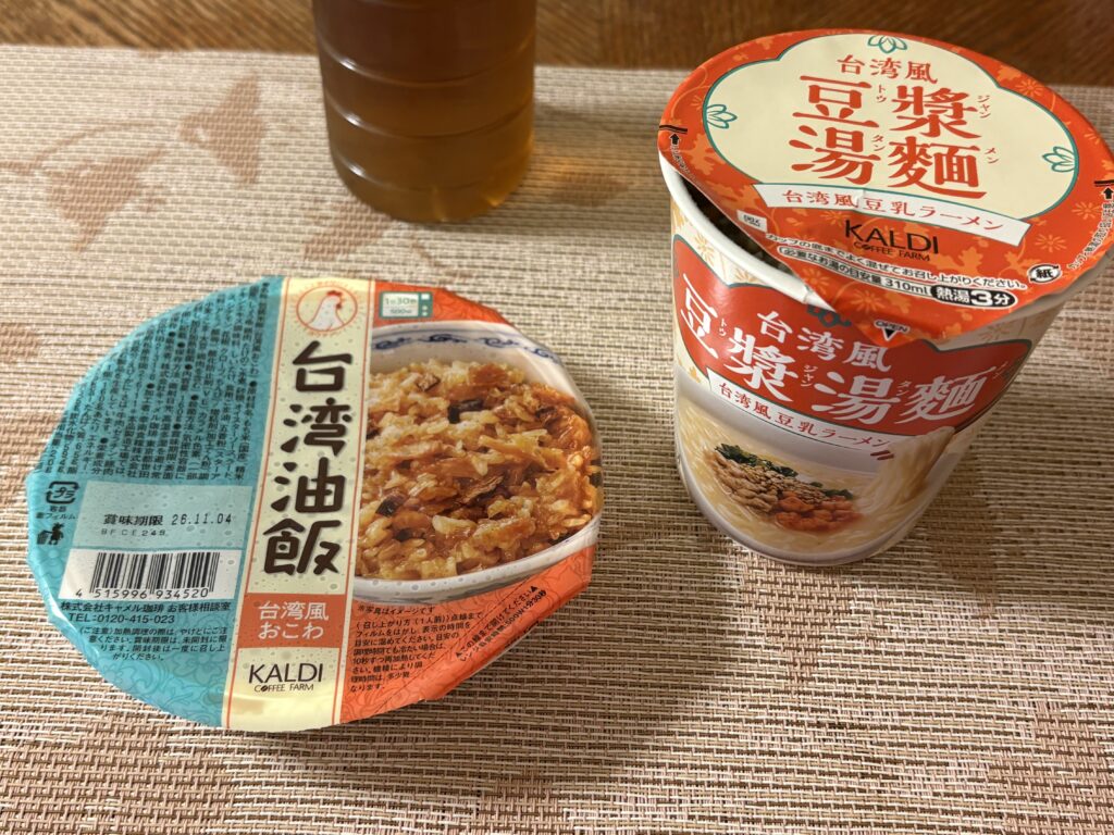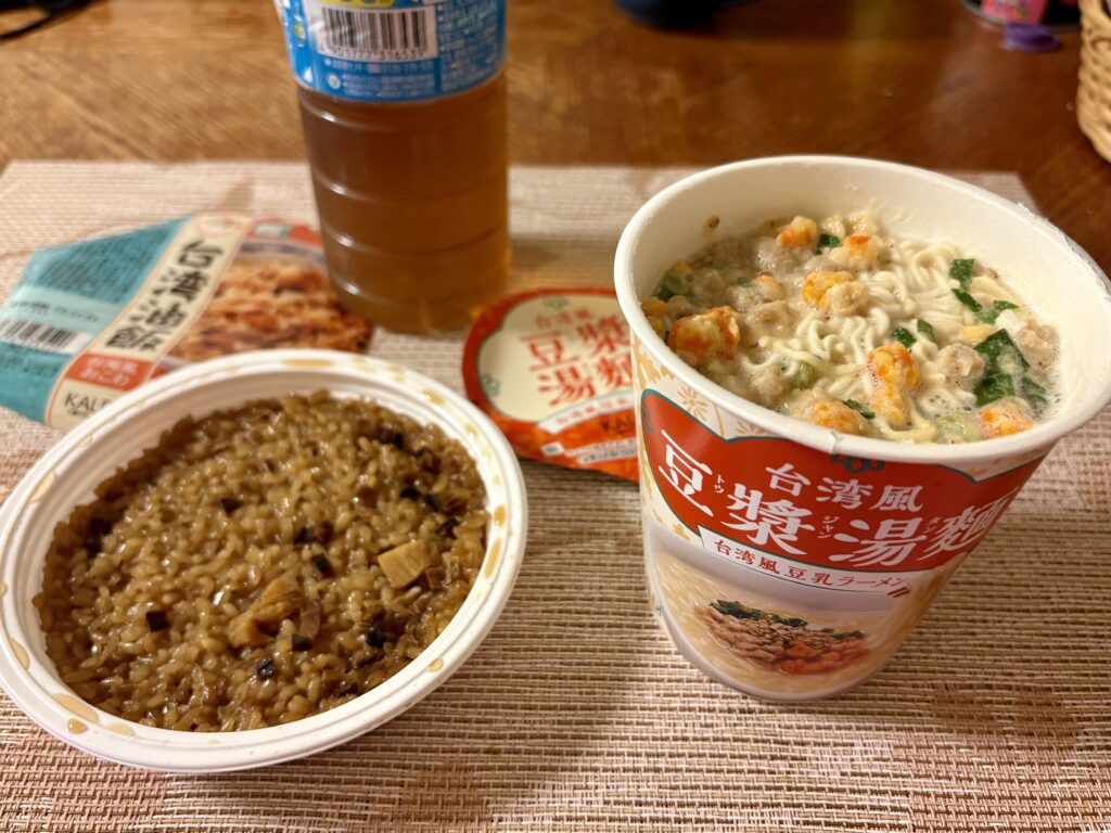 帰宅後昼ごはんを食べます。【KALDI】で買った台湾おこわと台湾カップラーメンです。お腹いっぱいにはなりませんでしたが、どちらもおいしかったです😃。