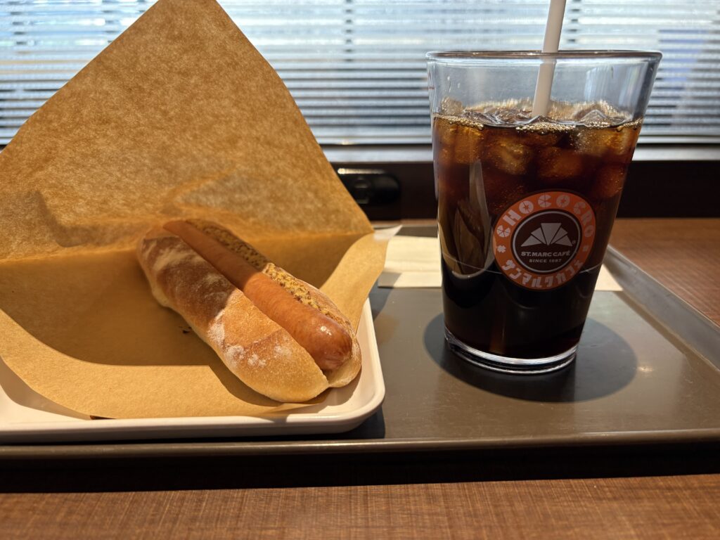 7時起床、9時に外出。駅前の駐車場が閉鎖になっていて寂しいです。その右横にある【マルクカフェ】に入ります。新発売のホットドッグとアイスコーヒーを買って2階に上がります。コーヒーマシンが故障してホットは作れないと言われました。お気に入り席は先客がいるのでセカンドベストに座ります😃。店内は普段よりかなりザワザワしていました。
