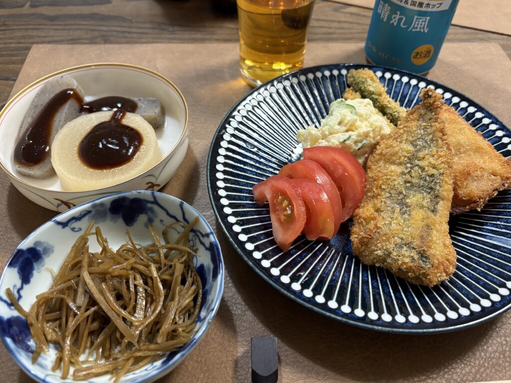 今日も実家で晩ごはんです。おかんメシは味噌田楽、きんぴら、ポテサラ、アジフライです🤗。〆は冷凍の鰻丼でした。