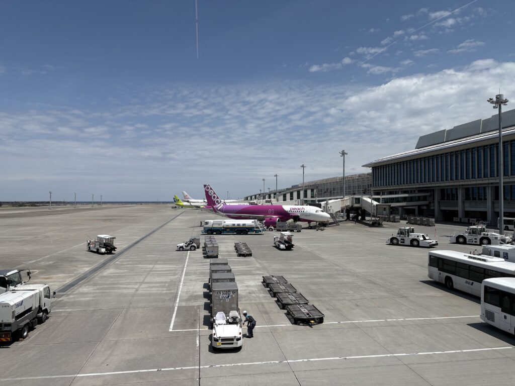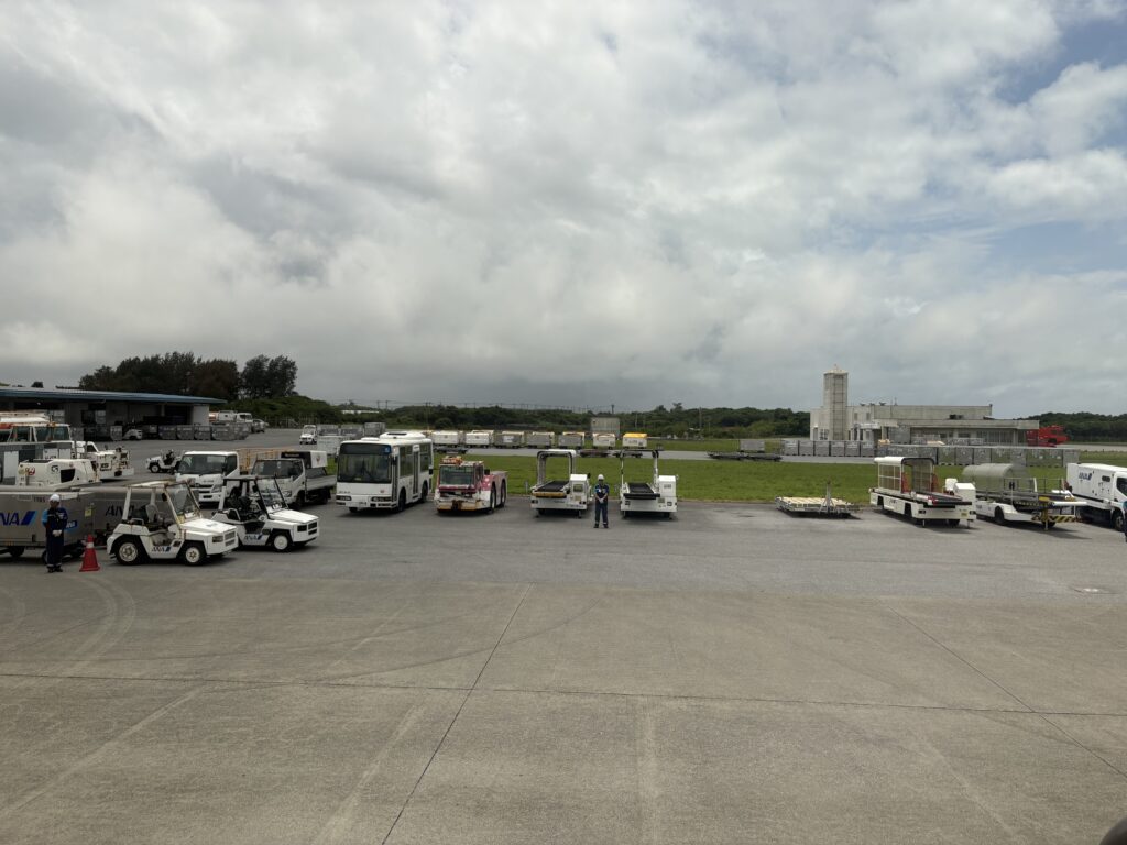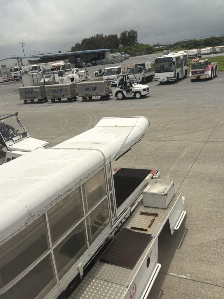 宮古空港へは予定より10分も早く到着します。那覇空港で機内へ荷物を運ぶ光景はよく見るのですが、空港で下ろす作業を初めて見ます。飛行機が停止したと同時にスピーディーに作業が始まります。もう少し見たかったのですが、前方の席なのですぐに降りる時間になりました。