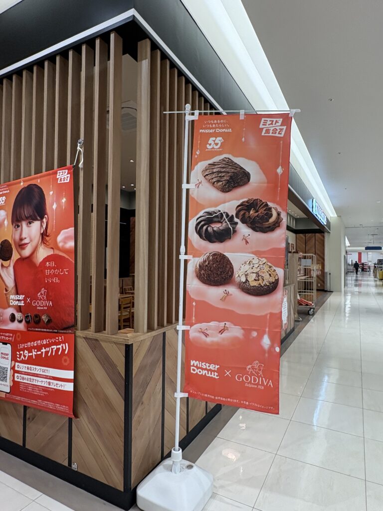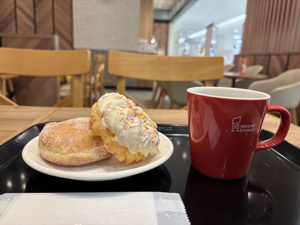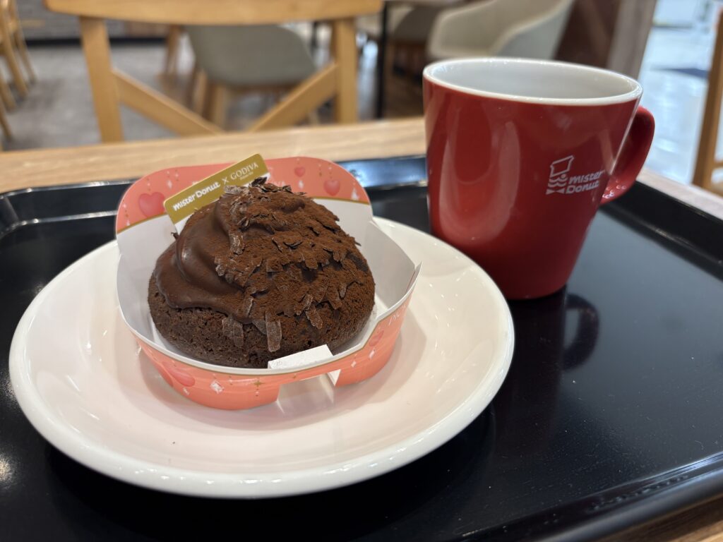 その後【ミスタードーナツ】へ。今日からミスド&GODIVAのコラボ商品が発売です。トリュフショコラドーナツ ノワールを食べます。ドーナツと言うよりケーキでした😃。仕事中に清掃スタッフの友人が声をかけてくれました。