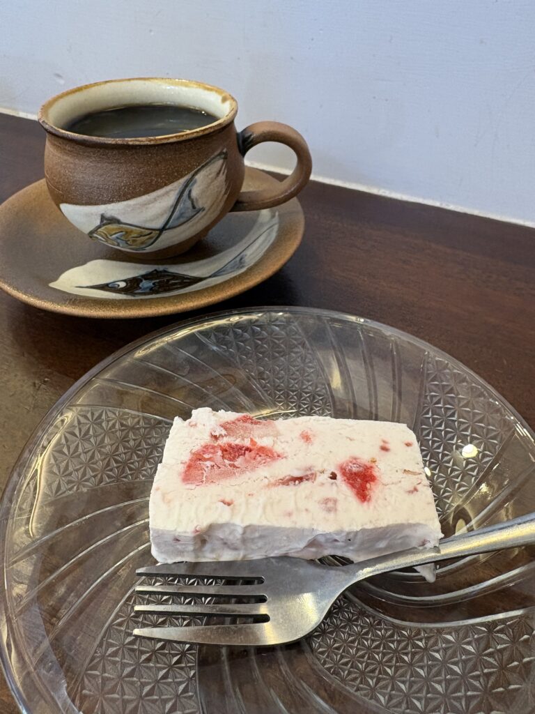 12時【さるぅ】でアナタビ常連さんと待ち合わせをします。ふたりとも今日のすすめは注文せず、私はいつものYamamoto Special にします。混んでいましたがカウンター席に座ったので、店主の宮内さんと3人でいろいろ話をしました🤗。デザートにイチゴのカッサータを食べました。冝保さんに14時に着きますと電話をして常連さんと別々の車で出発です。