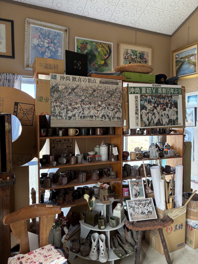 冝保さん宅に到着すると冝保さんがお出迎え😃。すぐに工房、作業場を案内してくれます。今日は本番を想定したモニターツアーです。ひと通り見学をした後、図書室で冝保さん作のカップにコーヒーを淹れてもらい、しばらく芸術全般の雑談をしました🤗。アナタビの体験ツアーでもかなりマニアックな内容になります。ここで一旦解散しました。