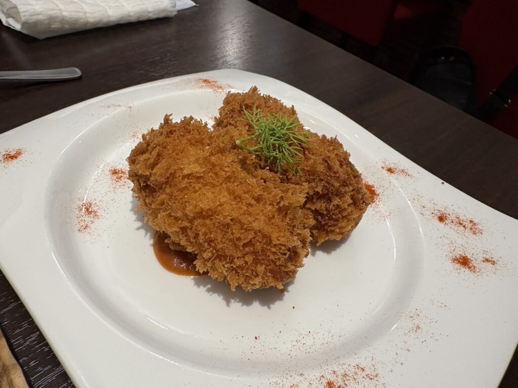 18時半ごろ、マジックアワーで空が赤く染まったので特別に屋上に上げてもらいます(ほかのお客はテラスから見ています)。最後の一品は1番好きな蟹クリームコロッケでした😋。