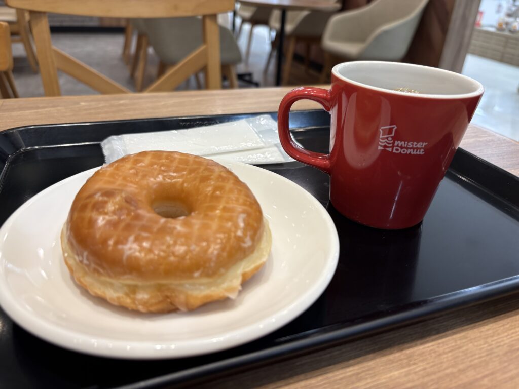 10:55【ミスタードーナツ】に到着。モーニングセットの時間に間に合いました😃。画像のドーナツとコーヒーで380円です。至急マスコミ各社に取材依頼を出す必要があり、パソコンで依頼文を作成。PDFに変換し、【ファミリーマート】のネットプリントに登録完了。