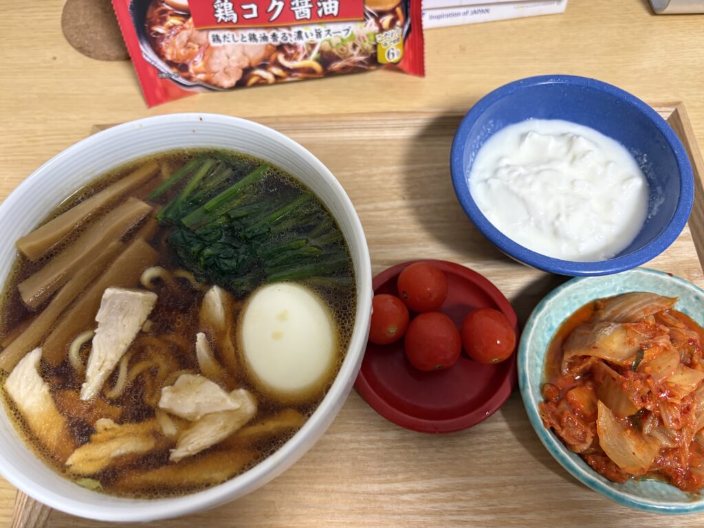 晩ごはんは「麺神」醤油味に鶏肉、メンマなどを乗せて食べます。メンマはこれが最後でした。ミニトマトが苦く感じるのは体調不良のせい?10時に寝床に入り、アップルウォッチで高得点の睡眠スコアを目指して寝ました💤