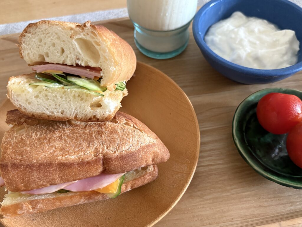 10時半に遅めの朝ごはんにします。【富士パン】のソフトフランスをトーストして、サンドイッチにして食べました。サンドイッチはこの食べ方が1番おいしいです😋 。
