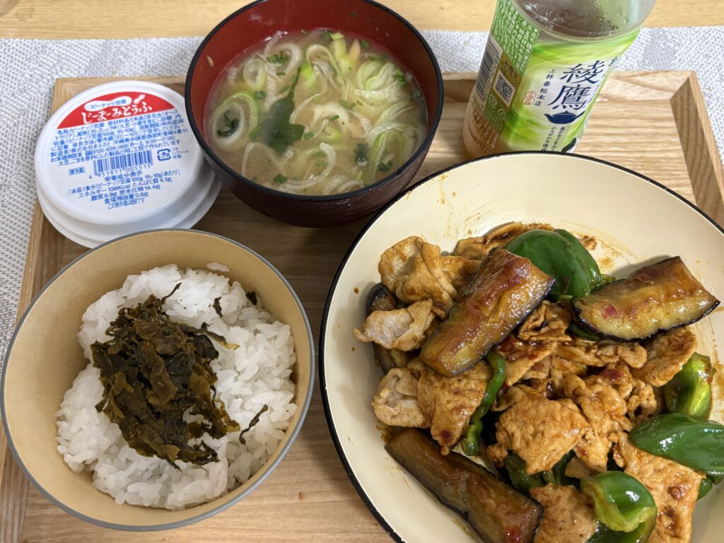16時半に遅い昼ごはんを作ります。豚肉、ナス、ピーマンの味噌炒めです。美味しくできました。デザートはまえさとのジーマーミー豆腐でした😋。