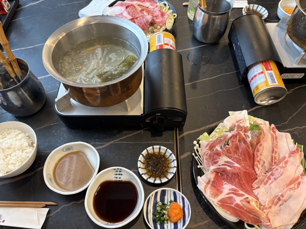 11時半に同じマンションに住むおじさんと駐車場で待ち合わせ。【しゃぶ庵本店】てランチを食べます。おじさんがメニューから宮古牛のすき焼きを選びます。まだ食べたことがないカレーにしたいところですが、カレーだと先に食べ終わるのであぐー豚のしゃぶしゃぶにします。鍋にしたので、ゆったり食事ができました🤗。