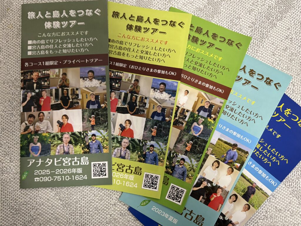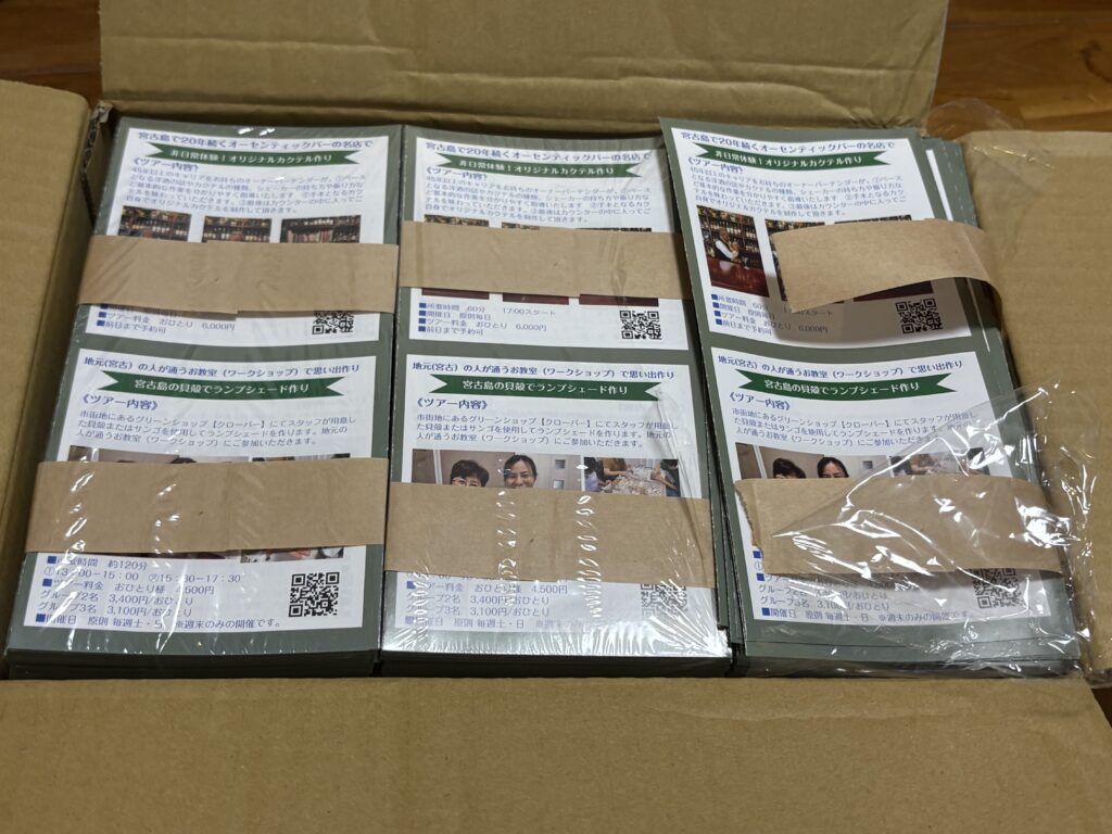 帰宅して郵便ポストを開けると配達通知が入っています。宅配ロッカーから荷物を取り出し家に入ります。アナタビ宮古島の今年のリーフレットです。過去のリーフレットを並べて撮影。インスタとFacebook にアップします。もう5年目かぁが率直な感情です😊。