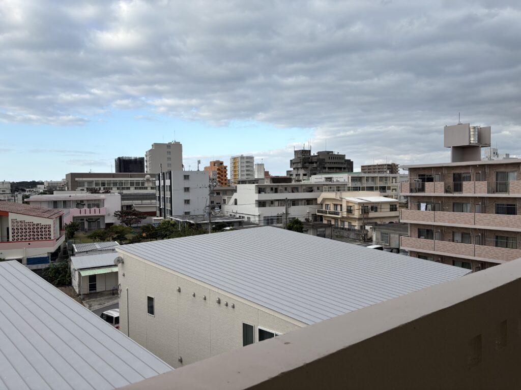 7時起床。上が玄関を開けた時のいつもの風景。下が2階上がった風景。最上階からは海が見えます😃。