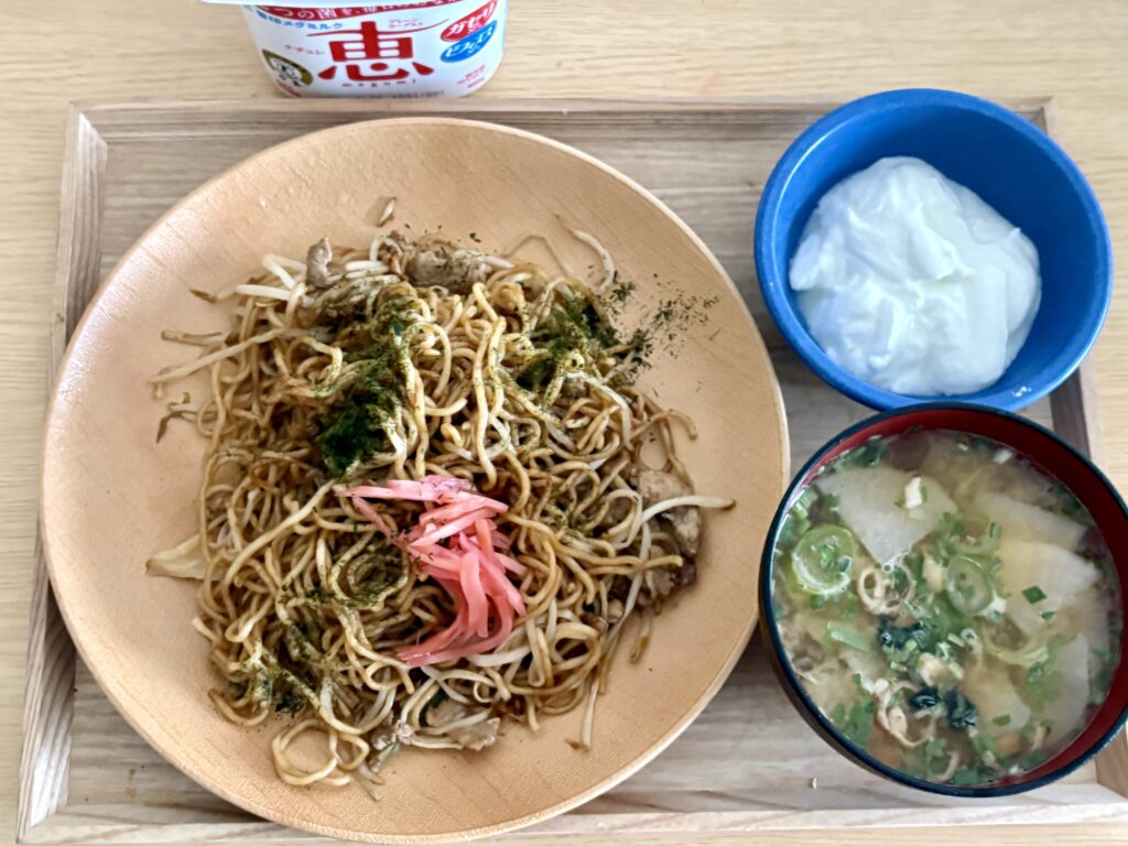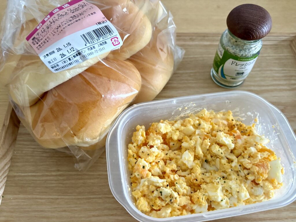 昼ごはんにマルちゃん焼きそば(アグー豚入り)と大根たっぷりのみそ汁を食べました。バターロールを買ったので、卵を茹でてたまごサラダを作ります。仕上げに雪塩のハーブ入りソルトドレッシングをかけて完成です。