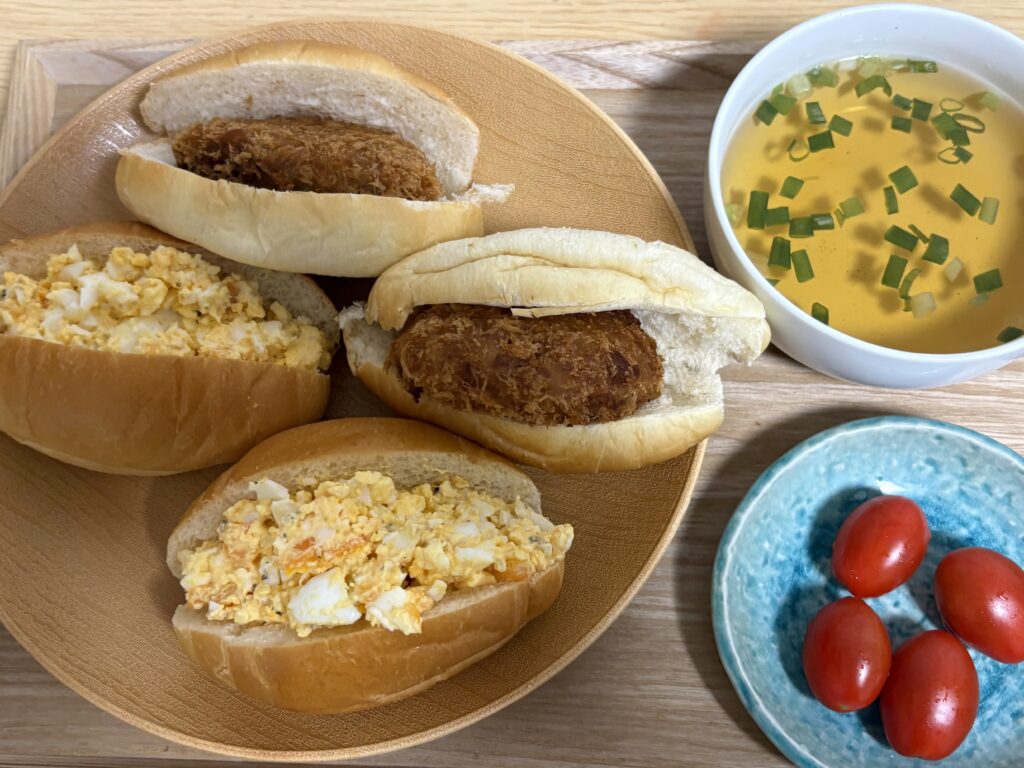 晩ごはんはたまごサラダパンとコロッケパンでした😃。アナタビ宮古島は年中無休、可能な限り即時対応なので、夜もお客様のメール対応をしました🤗。